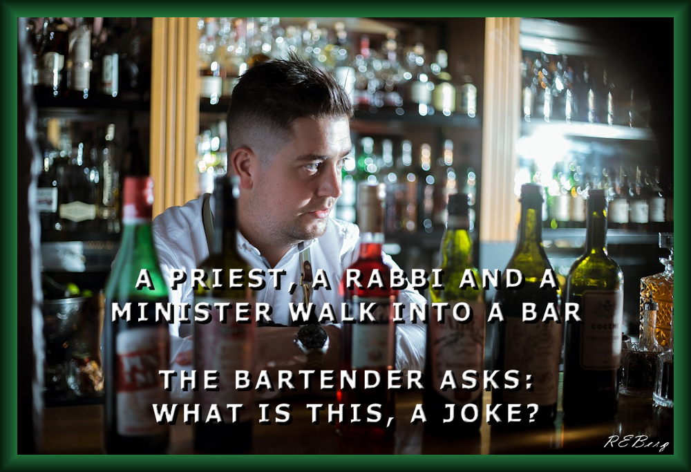 You Must Be Joking Image August 31, 2023 R.E. Berg humor, joke, Marginal Entertainment, meme, Occupational Oddities bar, bartender, minister, priest, rabbi, walk