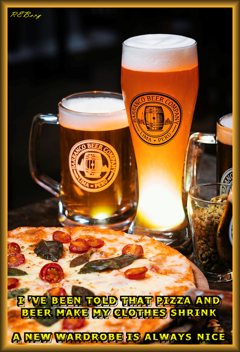 Fashionable Feasting Image January 26, 2023 R.E. Berg Culinary Curiosities, Fabulous Fashion, humor, joke, meme beer, clothes, new, pizza, shrinkage, wardrobe