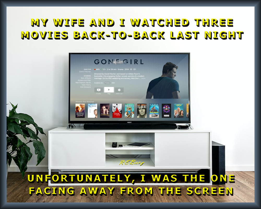 Loved The Soundtracks Image December 4, 2023 R.E. Berg humor, joke, Marginal Entertainment, meme, Punishingly Punny, Rocky Relationships away, back-to-back, facing, movies, screen, watched