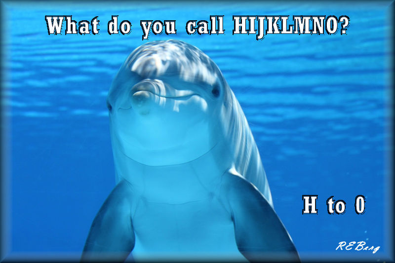 Something In The Water Image August 30, 2023 R.E. Berg humor, joke, meme, Punishingly Punny Too, Ready Reading alphabet, dolphin, h2o, water