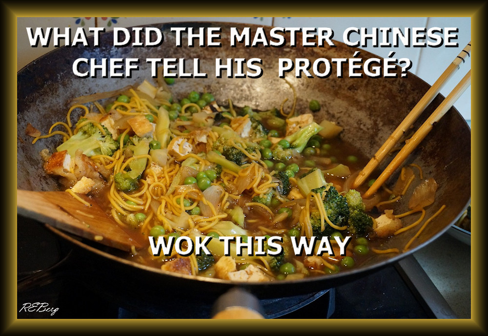 Marching Order Image September 14, 2023 R.E. Berg Culinary Curiosities, humor, joke, meme, Punishingly Punny chef, Chinese, master, protege, tell, this, walk, way, wok