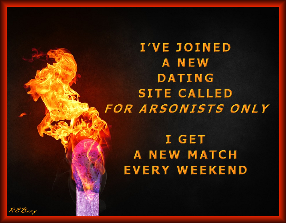 Light My Fire Image July 5, 2023 R.E. Berg humor, joke, meme, Punishingly Punny, Rocky Relationships arsonists, dating, exclusive, match, site, weekend