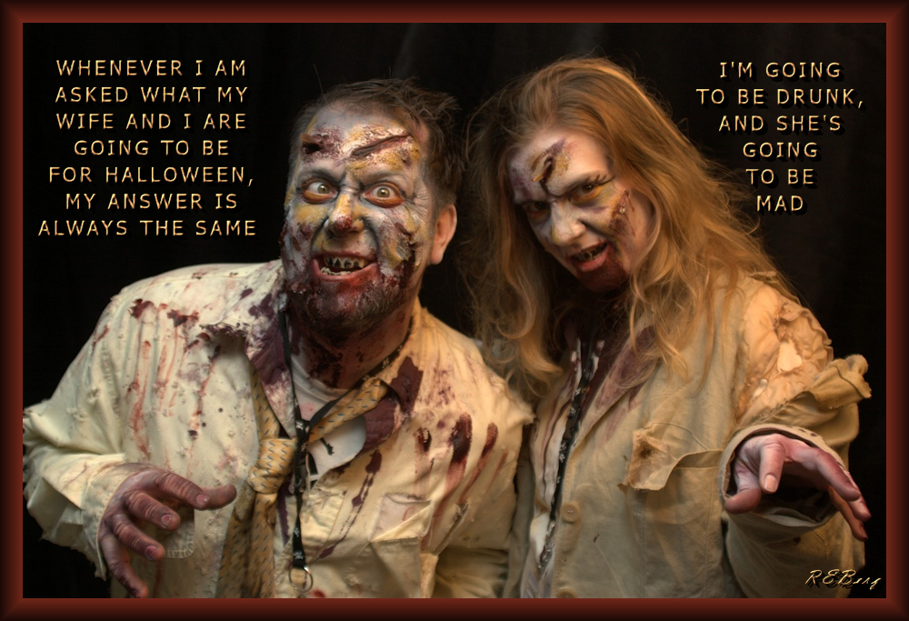 Perpetual Plan Image October 30, 2023 R.E. Berg humor, joke, meme, Punishingly Punny Too, Rocky Relationships, Special Days costumes, drunk, Halloween, husband, mad, wife, zombies