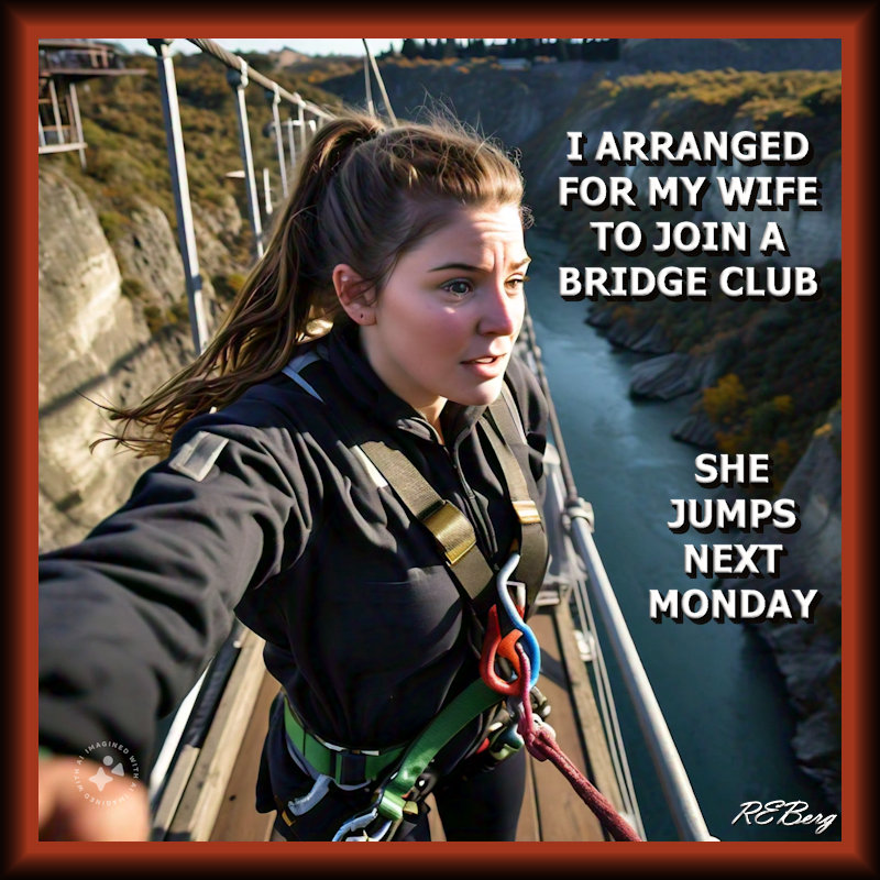 Abridgment Image November 13, 2024 R.E. Berg humor, Irrational Recreation, joke, meme, Punishingly Punny, Rocky Relationships bungee, club, join, jump, wife