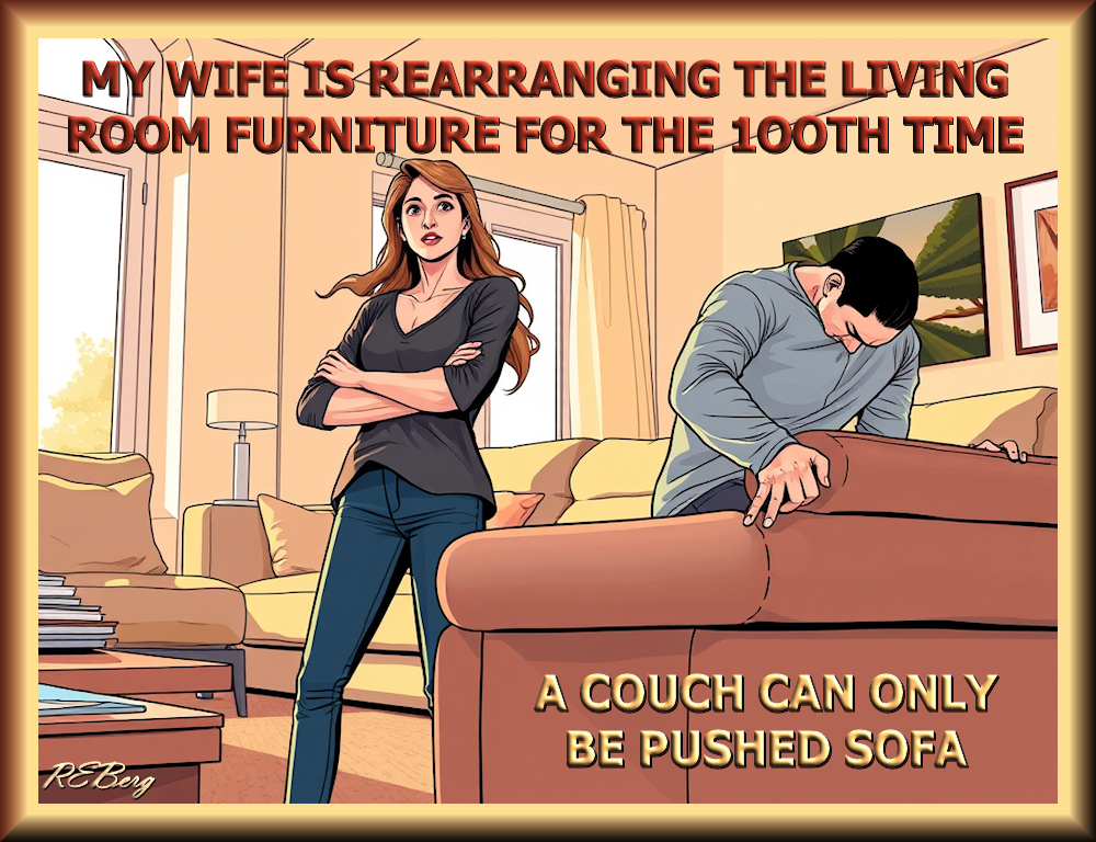 Relocation Dislocation Image July 28, 2025 R.E. Berg humor, Irrational Recreation, joke, Locational Logic, meme, Punishingly Punny Too, Random Observations, Rocky Relationships, Social Hostility can only be pushed, couch, furniture, husband, lviing room, rearranging, so far, sofa, wife