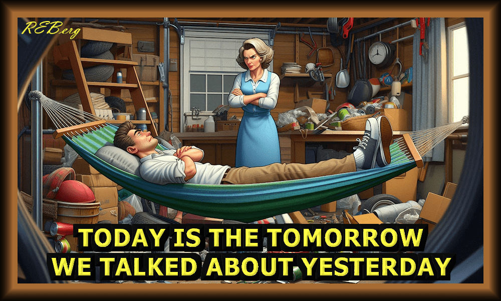 Time Has Come Image November 1, 2025November 1, 2025 R.E. Berg humor, joke, meme, Mental Gymnastics, Random Observations, Social Hostility, That's Living angry, garage, hammock, husband, junk, procrastination, resting, today, tomorrow, we talked about, wife