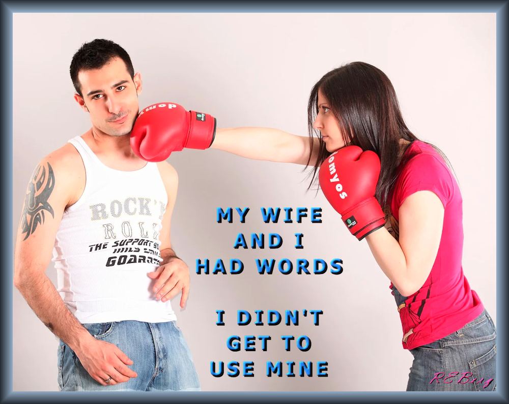 Good Talk Image September 23, 2023 R.E. Berg humor, joke, meme, Punishingly Punny, Rocky Relationships argument, boxing, gloves, punched, speechless, wife, words