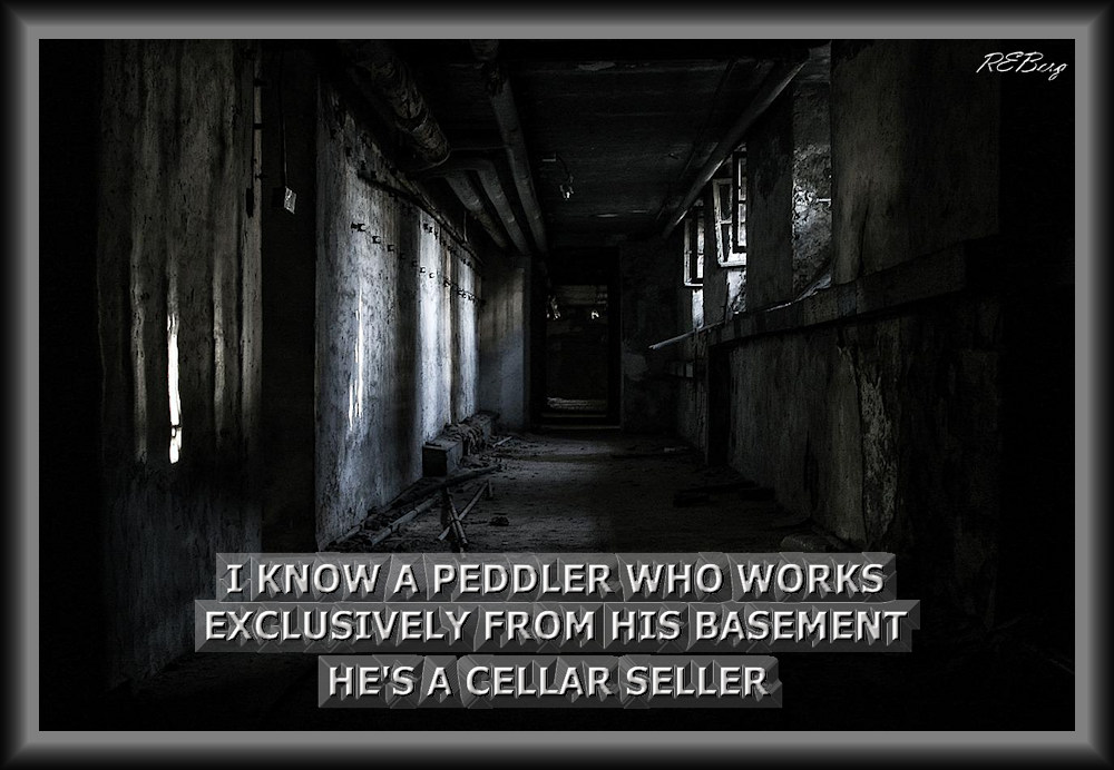 Underground Marketing Image April 16, 2023 R.E. Berg humor, joke, meme, Occupational Oddities, Punishingly Punny Too basement, cellar, exclusively, know, peddler, seller, works